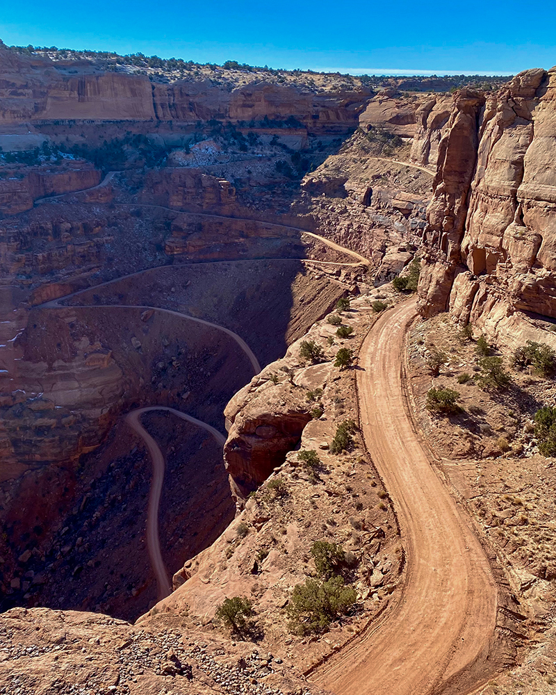 Wenn du dich mal ein wenig außerhalb der befahrbaren Pisten bewegen möchtest, dann ist der Shafer Trail die richtige Adresse für dich. Du brauchst auf jeden Fall ein Allradfahrzeug - würdest du die Zick-Zick-Route des Shafer Trails hinunter in den Canyon noch mit einem normalen Fahrzeug befahren können, ist spätestens unten im Canyon Schluss. Hier geht der Shafer Trail in die Potash Road über, für die du wirklich einen Geländewagen benötigst. 33 Kilometer geht es über blanke Felsen und durch kleine Flüsse hindurch, ehe du an den Potash Pools wieder Asphalt unter die Räder bekommst.