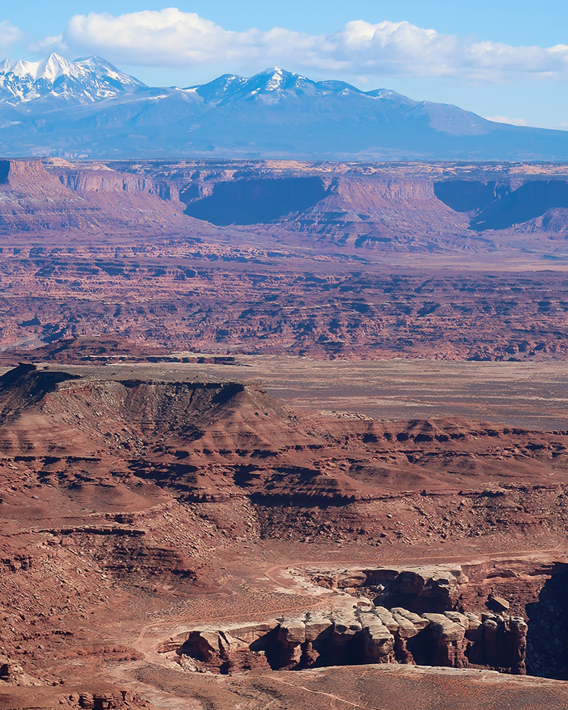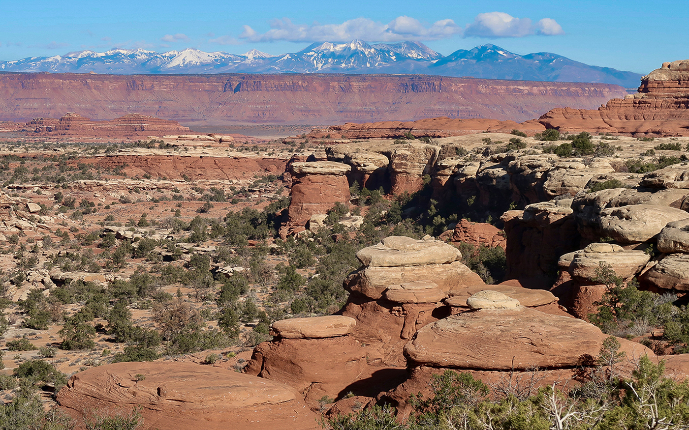 Ein gigantischer Ausblick über die raue Schönheit des Plateaus bietet sich, das durch die spitz herausragenden Nadeln vom Maze und Needles Distrikt unterbrochen wird. Im Hintergrund erstrecken sich zudem die La Sal Berge - ein gigantisches Bild!