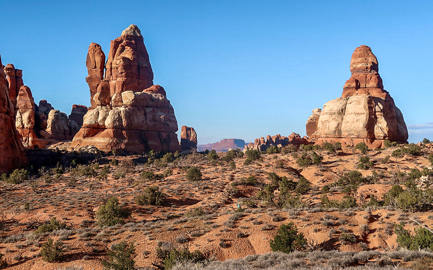 Der südlichste Abschnitt des Canyonlands Nationalparks ist nach seiner Optik benannt: wie Nadeln stechen die Felszinnen aus der Landschaft hervor. Doch auch Schluchten und Natursteinbögen, die dem Arches Nationalpark ähnlich sind, prägen die Landschaft.