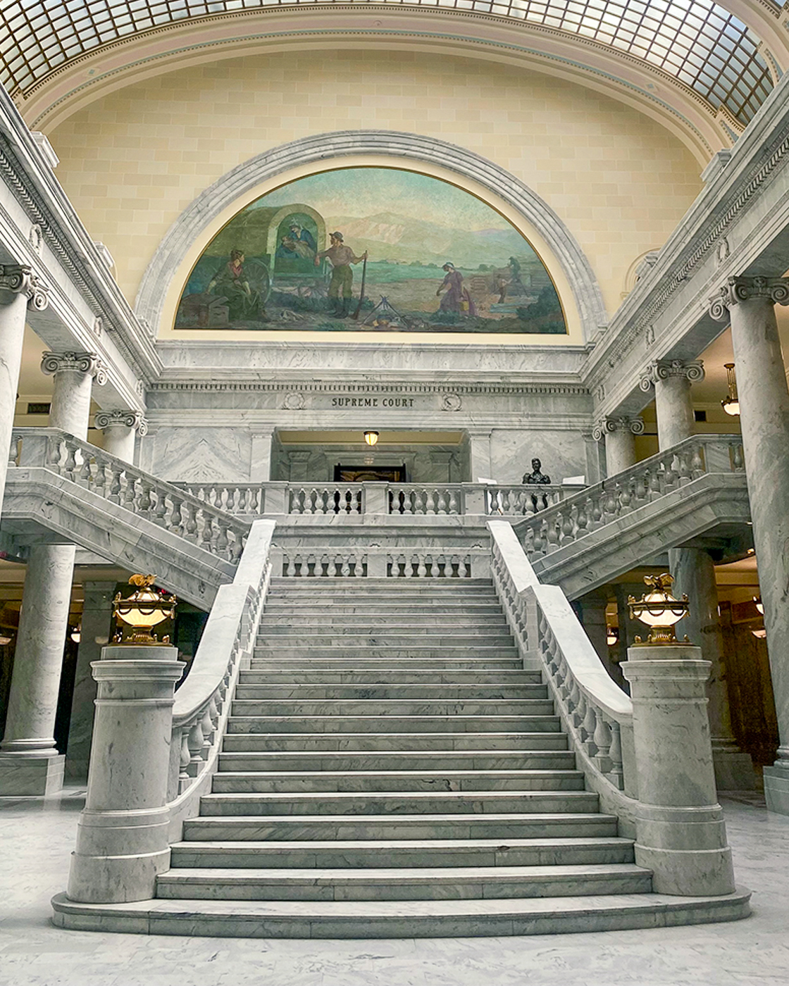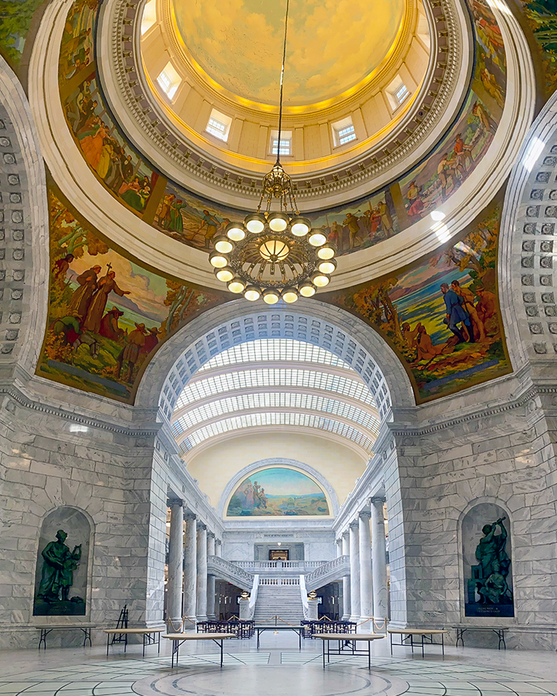 Das Regierungsgebäude von 1916 ist ein prächtiges Gebäude, das etwas erhöht auf einem Hügel steht. Es ist zu Recht ein beliebtes Fotomotiv von Salt Lake City. Zudem ist es Besuchern frei zugänglich und lohnt mit der schönen Architektur und den bunten Wandbildern auf jeden Fall auch einen Besuch von innen.