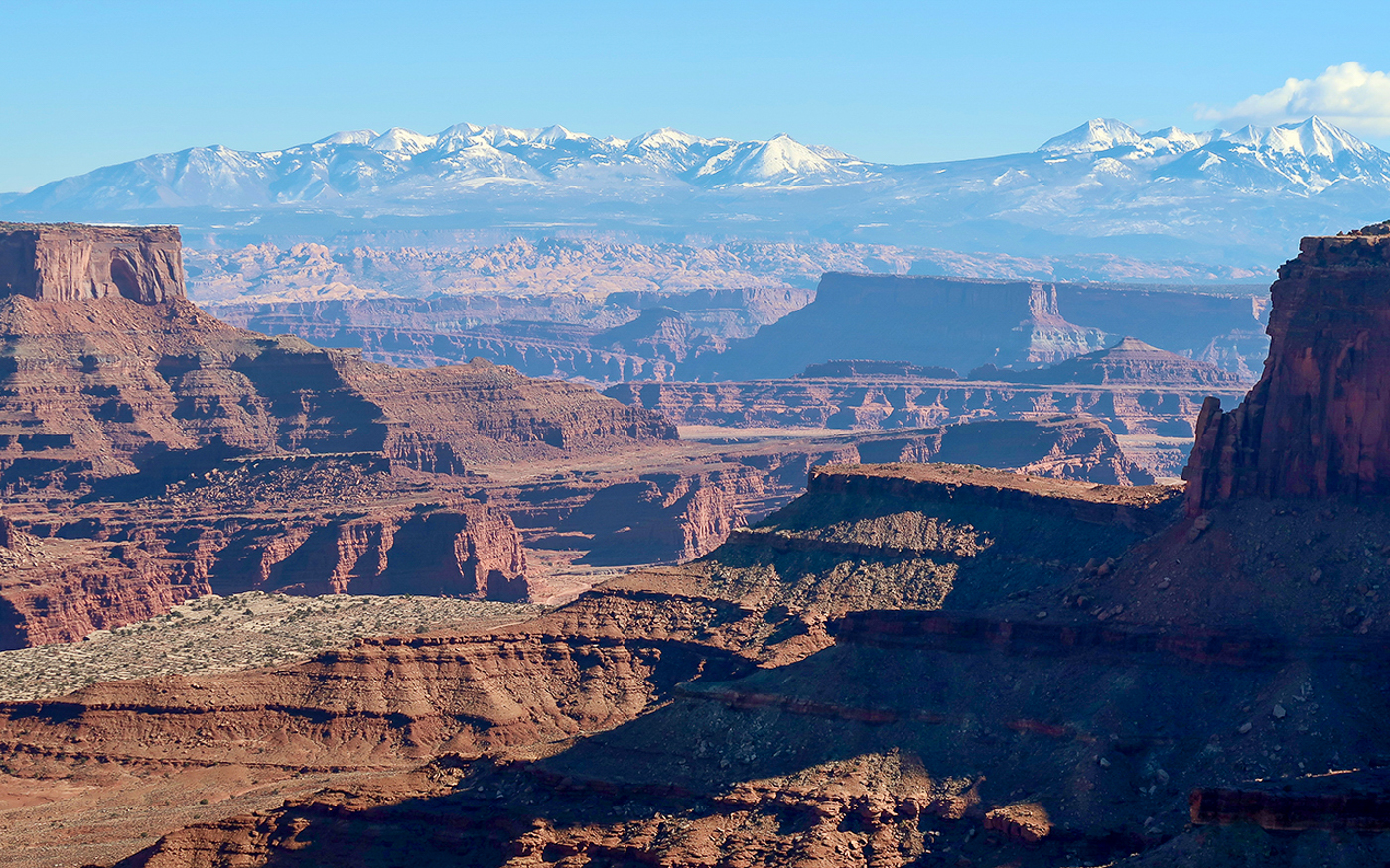 Am einfachsten gelangst du in den nördlichen Teil des Parks: Der Island of the Sky Abschnitt besteht aus einer 19 Kilometer langen Panoramastraße, die dich zu faszinierenden Aussichtspunkten über das Plateau und die Schluchten des Colorado River führt. Hier kann ich dir auch sehr die kurze Wanderung zur Mesa Arch empfehlen. Der kleine Felsbogen bietet den perfekten Bilderrahmen für das gigantische Panorama im Hintergrund.