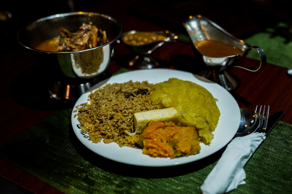 In Restaurants ordert man am besten „Luwombo“, herzhafte Fleisch-Stews, die im Bananenblatt gegart werden. Auch die aus Indien stammenden frittierten Samosas sind weit verbreitet und gefüllt mit Fleisch und/oder Gemüse. Das ugandische Grundnahrungsmittel ist Matoke, die Kochbanane, die sich als Sättigungsbeilage in nahezu jedem Gericht finden lässt.