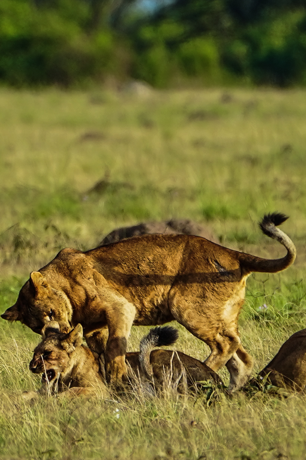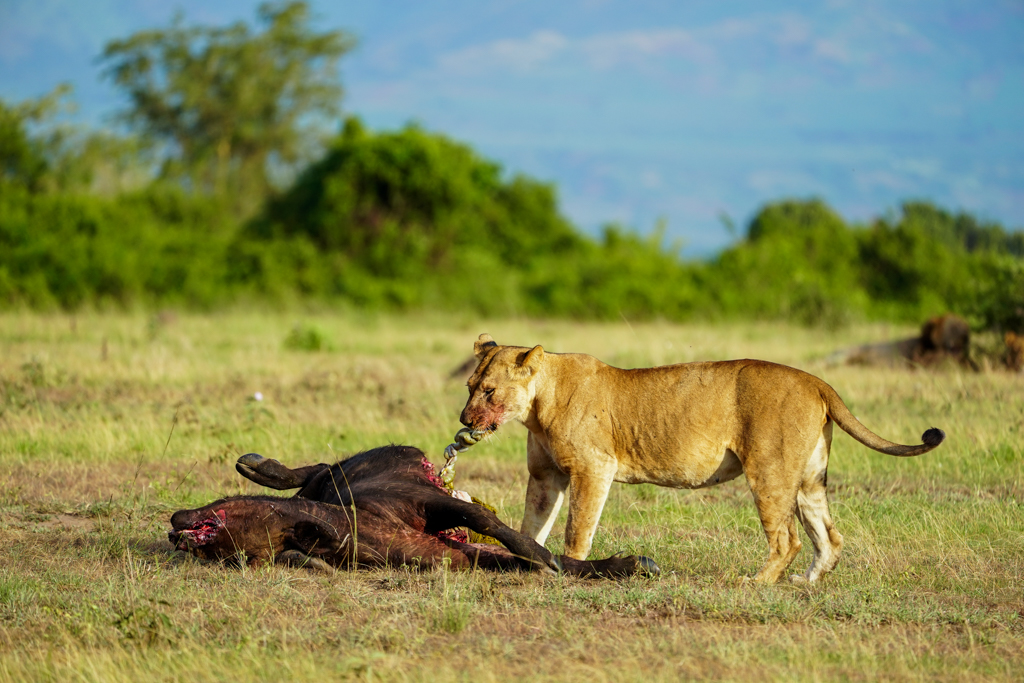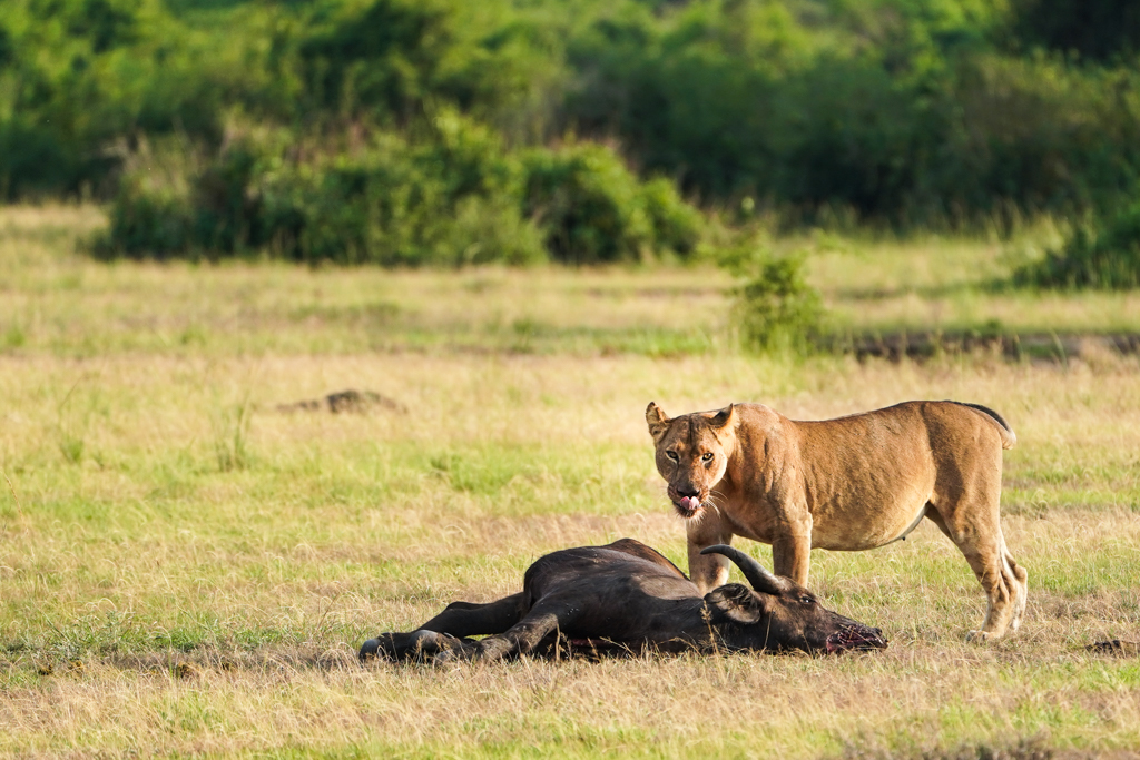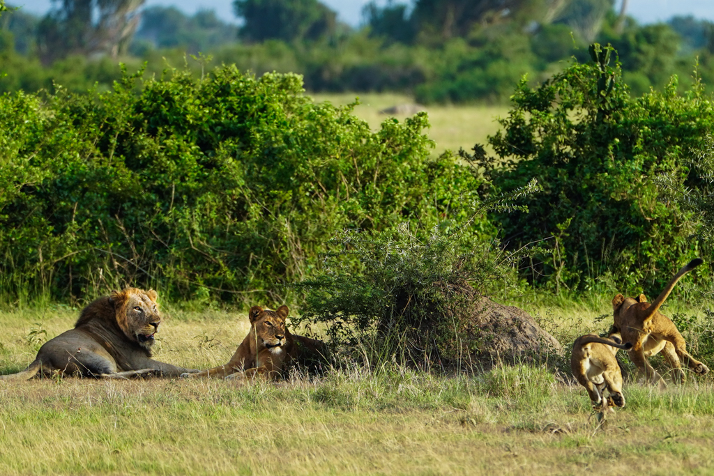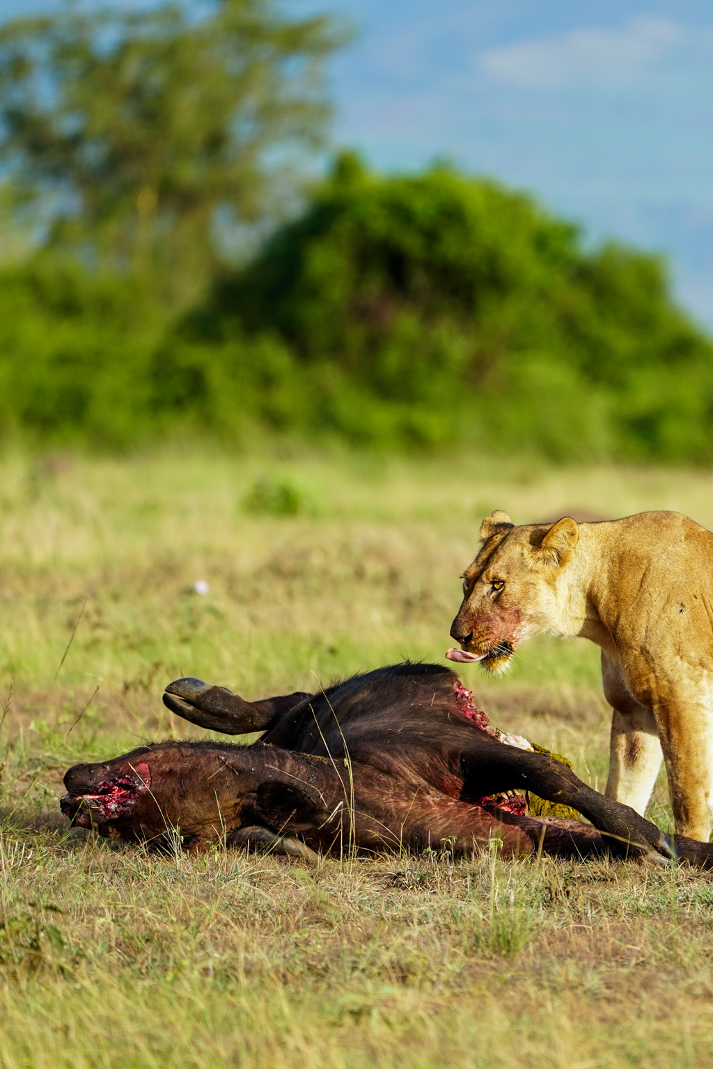 Auch hier habe ich Glück: Nach nur wenigen Kilometern, vorbei an Antilopen, Wasserbüffeln und Warzenschweinen, sehen wir eine ganze Löwenfamilie beim Frühstück. Sie haben sich einen schmackhaften Wasserbüffel gerissen, und während Papa und Mama Löwe sich bereits vollgefressen im Schatten räkeln, dürfen sich die Kinder mit dem Schwanz des Tiers vergnügen. Die Büffel-Karkasse wird derweil von einer Löwin ausgenommen. Ich stehe nur 50 Meter entfernt und beobachte das Naturschauspiel durch die Linse der Kamera. Wow.