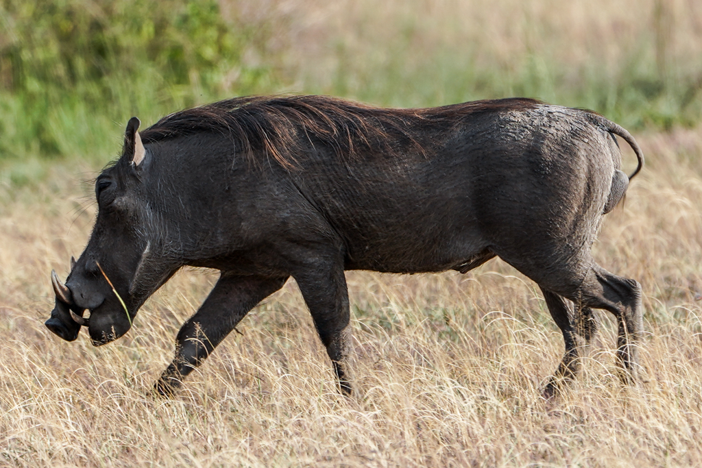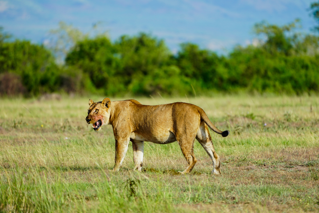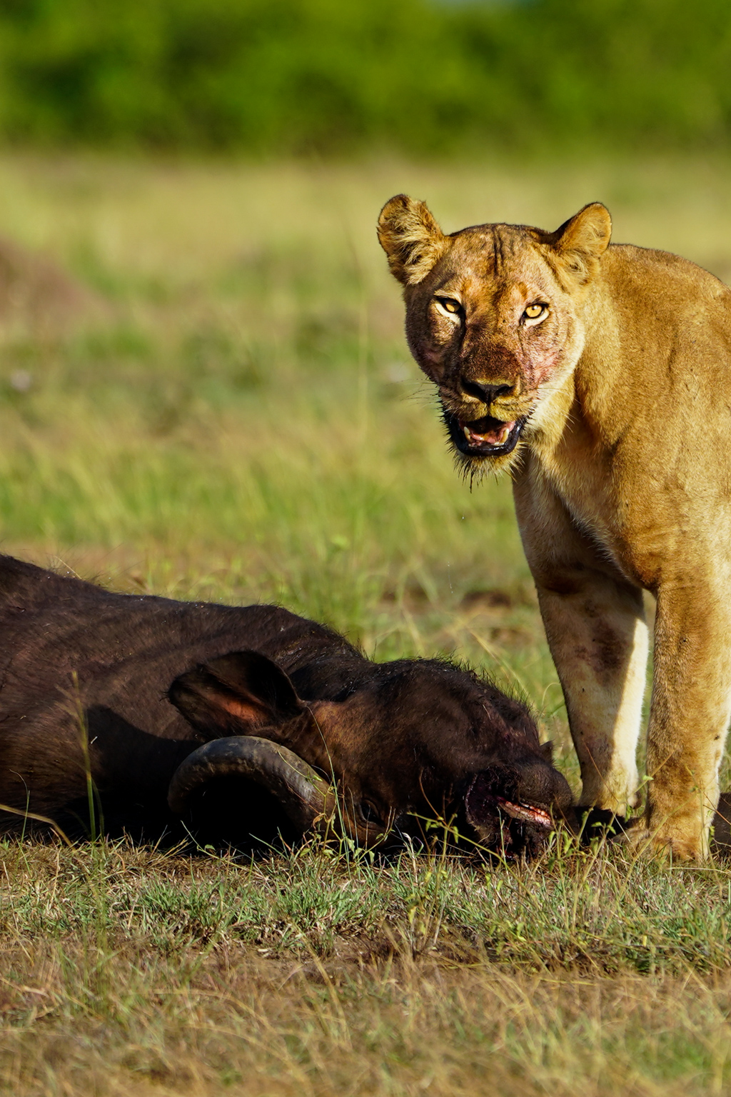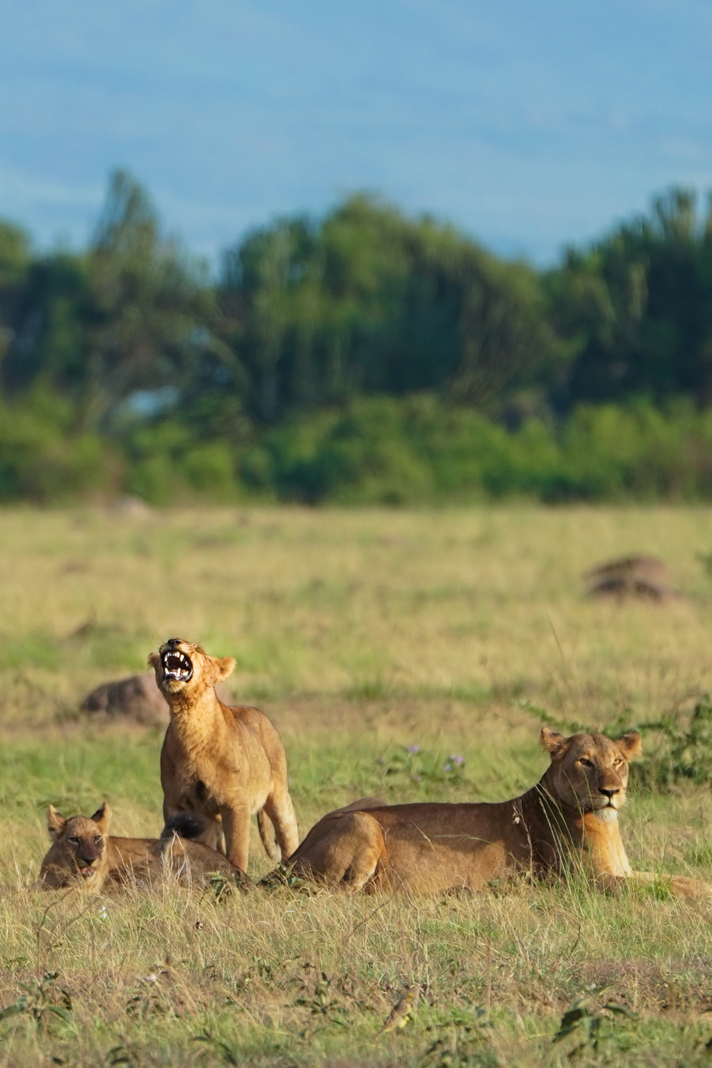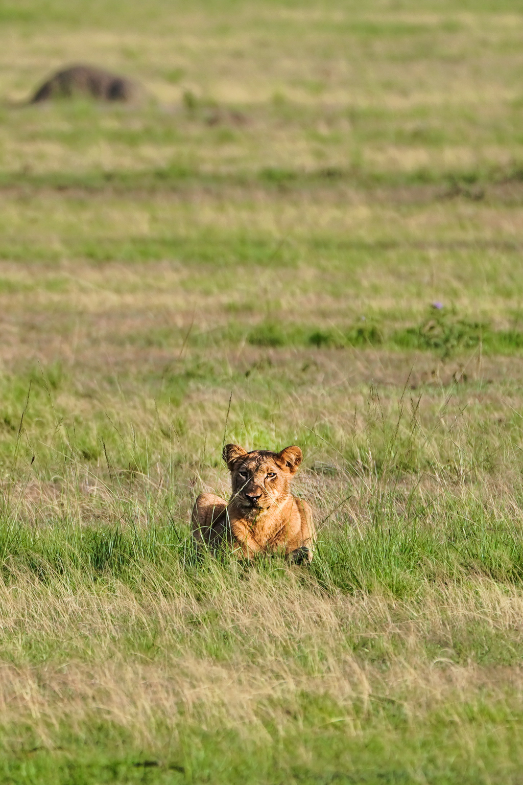 Auch hier habe ich Glück: Nach nur wenigen Kilometern, vorbei an Antilopen, Wasserbüffeln und Warzenschweinen, sehen wir eine ganze Löwenfamilie beim Frühstück. Sie haben sich einen schmackhaften Wasserbüffel gerissen, und während Papa und Mama Löwe sich bereits vollgefressen im Schatten räkeln, dürfen sich die Kinder mit dem Schwanz des Tiers vergnügen. Die Büffel-Karkasse wird derweil von einer Löwin ausgenommen. Ich stehe nur 50 Meter entfernt und beobachte das Naturschauspiel durch die Linse der Kamera. Wow.