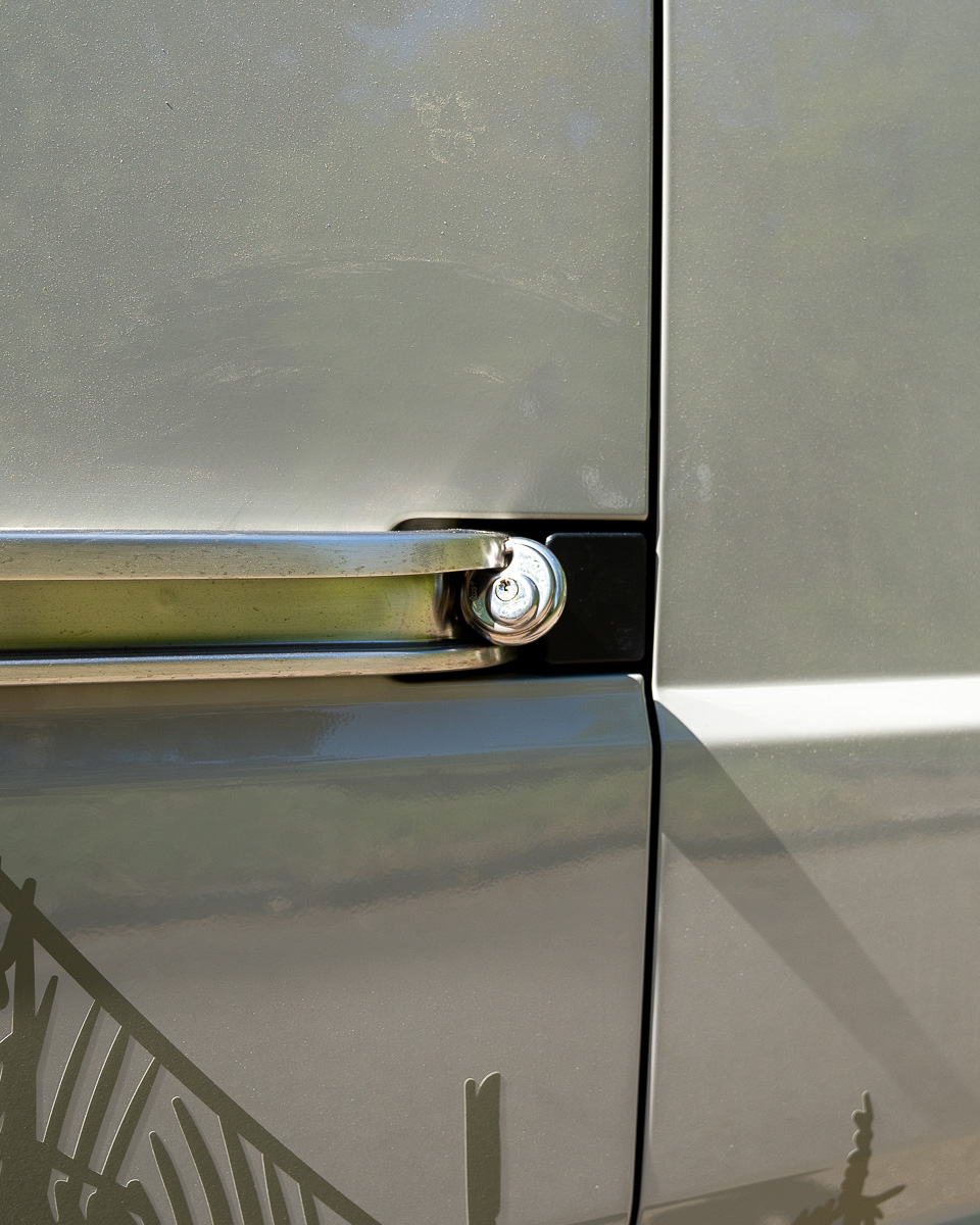 Es gibt in diversen Campingshops teure Verriegelungen für die seitliche Schiebetüre. Es geht allerdings einfacher: Loch bohren (siehe Bild) und ein normales Abus Disus Vorhängeschloss anbringen. Fertig.