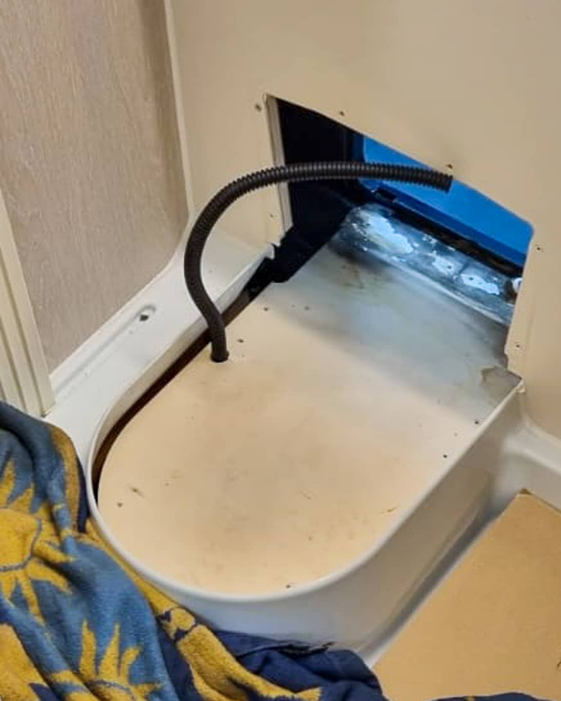 Schritt 1: Umbau Chemietoilette zu Trenntoilette – die alte Thetford Toilette muss raus: