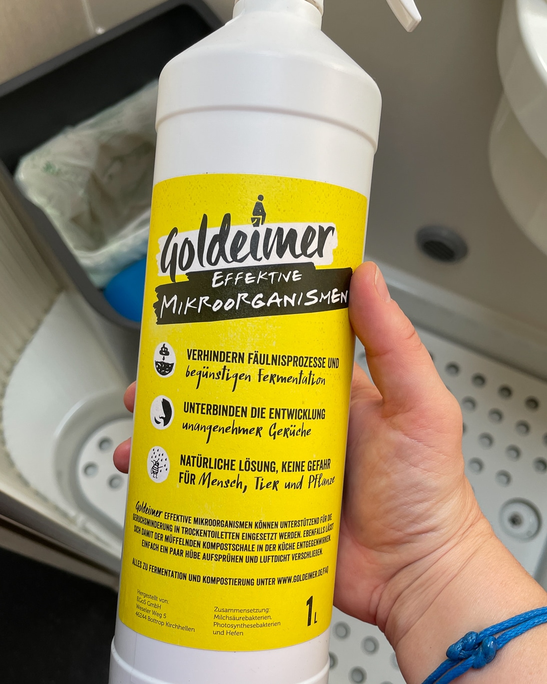 - Probiere, welcher Zusatz für dich am besten ist: Sägespäne, Haustierstreu oder wie bei mir das "Kackpulver" und als Zusatz Effektive Mikroorganismen "EM" (beides von Goldeimer).