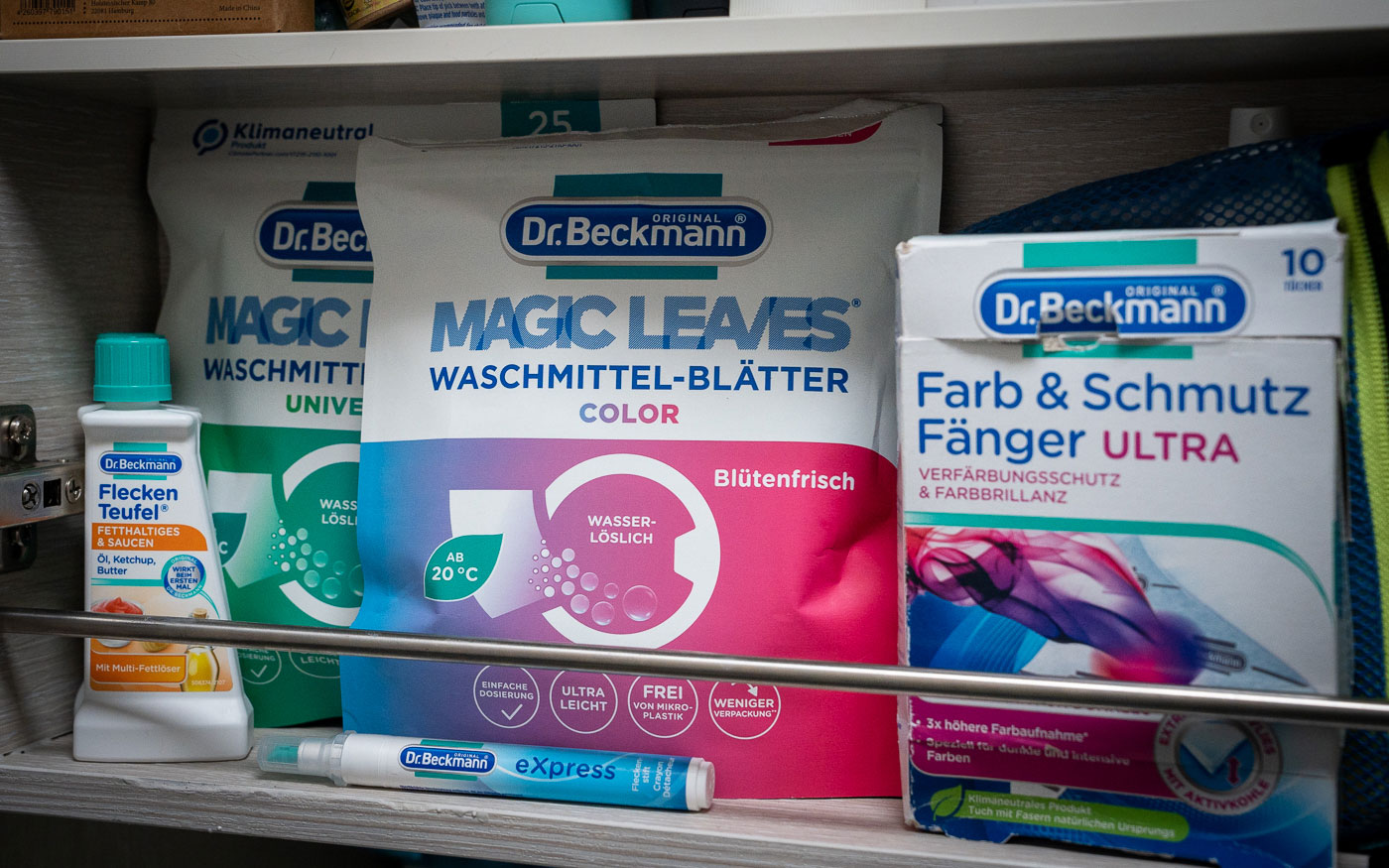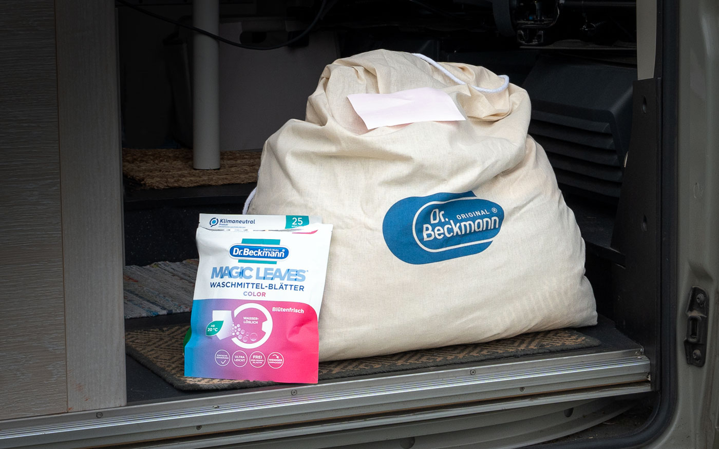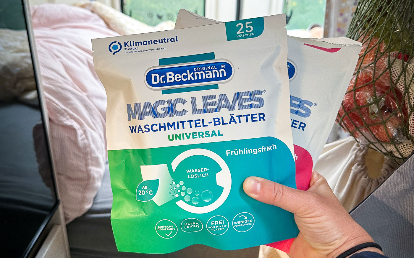 Auf manchen Campingplätzen (selten) wird ein Waschmittel gestellt, das du nutzen sollst. Das mag ich nicht und verwenden lieber mein eigenes: Waschmittelblätter MAGIC LEAVES von Dr. Beckmann. Diese gibt es für bunte und weiße Wäsche.